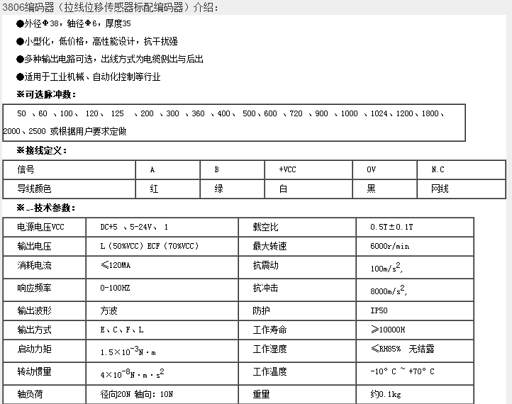 3806電梯位移編碼器把角位移或直線位移轉換成電信號,前者稱為碼盤,后者稱為碼尺。按照讀出方式編碼器可以分為接觸式和非接觸式兩種;按照工作原理編碼器可分為增量式和絕對式兩類。增量式編碼器是將位移轉換成周期性的電信號,再把這個電信號轉變成計數脈沖,用脈沖的個數表示位移的大小。絕對式編碼器的每一個位置對應一個確定的數字碼,因此它的示值只與測量的起始和終止位置有關,而與測量的中間過程無關。 電梯位移編碼器由一個中心有軸的光電碼盤,其上有環形通、暗的刻線,有光電發射和接收器件讀取,獲得四組正弦波信號組合成A、B、C、D,每個正弦波相差90度相位差(相對于一個周波為360度),將C、D信號反向,疊加在A、B兩相上,可增強穩定信號;另每轉輸出一個Z相脈沖以代表零位參考位。由于A、B兩相相差90度,可通過比較A相在前還是B相在前,以判別編碼器的正轉與反轉,通過零位脈沖,可獲得編碼器的零位參考位。